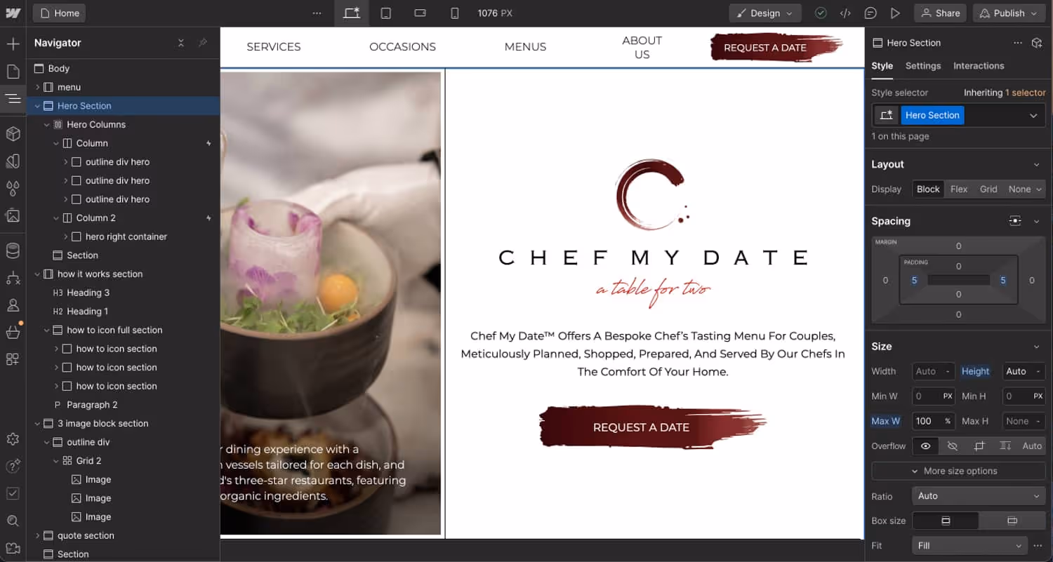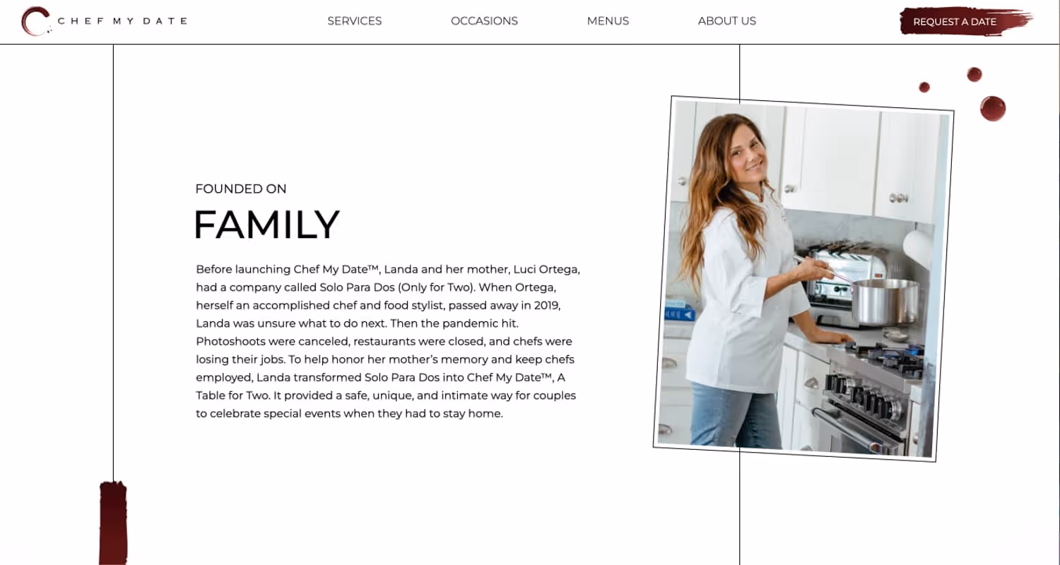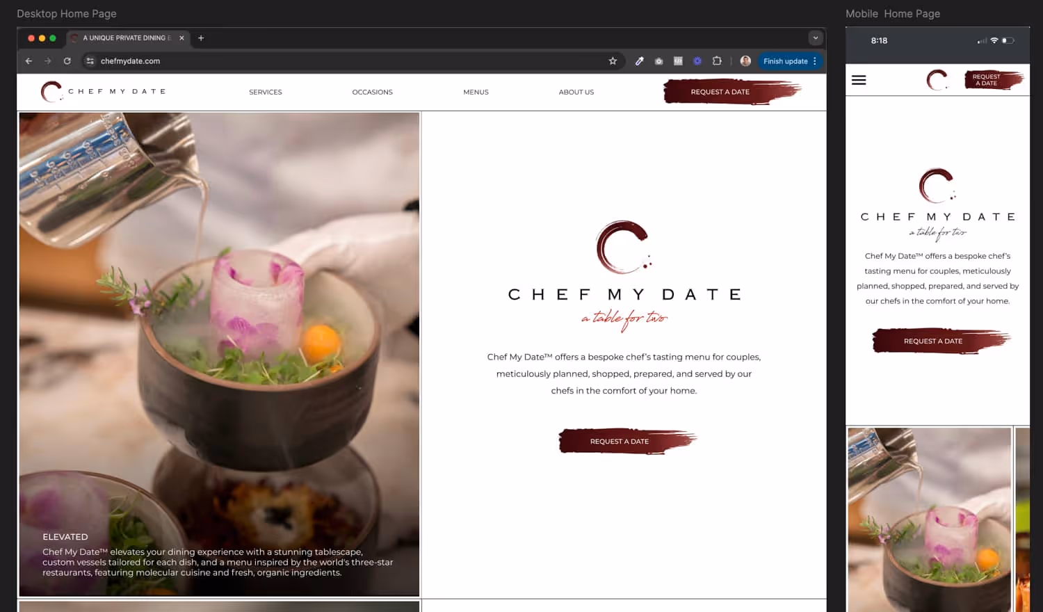 The owners of Chef My Date bring an unparalleled passion and dedication to their craft. With years of experience in the culinary world, they have perfected the art of creating intimate, unforgettable dining experiences that cater to the specific desires of each client. Their commitment to excellence and their personal touch in every meal they prepare are what set Chef My Date apart from others in the industry. It was essential for us to ensure that their website not only showcased their culinary talents but also reflected the warm, inviting, and meticulously detailed approach they bring to each dining experience.